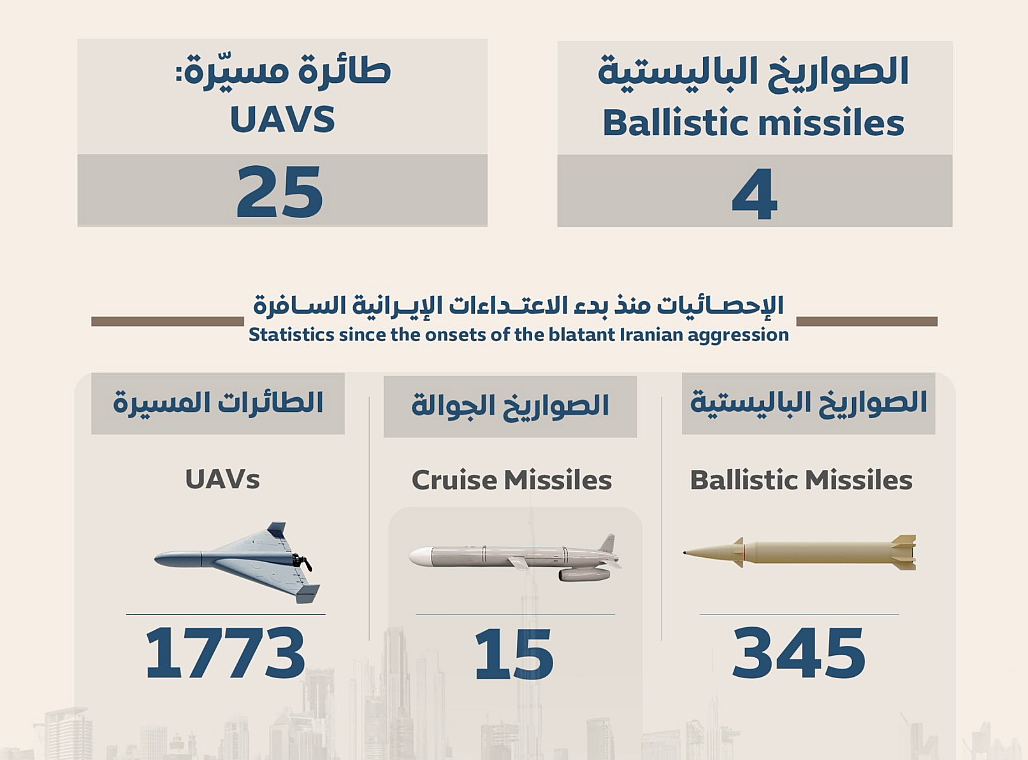 UAE reports interception of 4 missiles and 25 drones from Iran on March 22