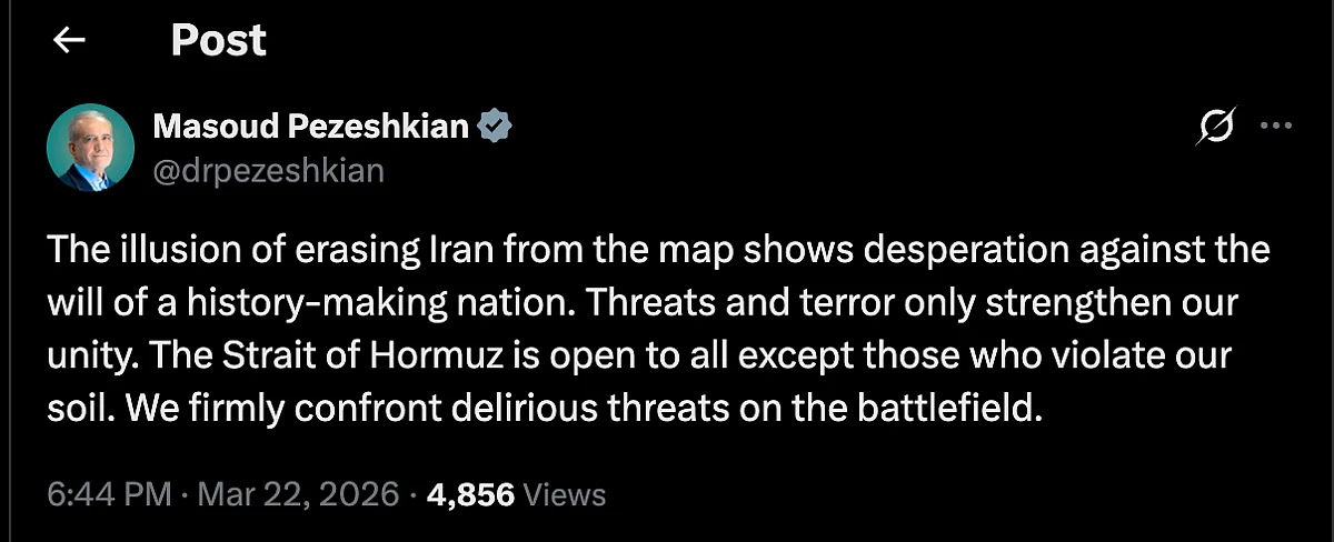 While he did not explicitly name any country, his use of “you” appeared to be directed at the United States. - Strait of Hormuz is not closed. Ships hesitate because insurers fear the war of choice you initiated—not Iran
