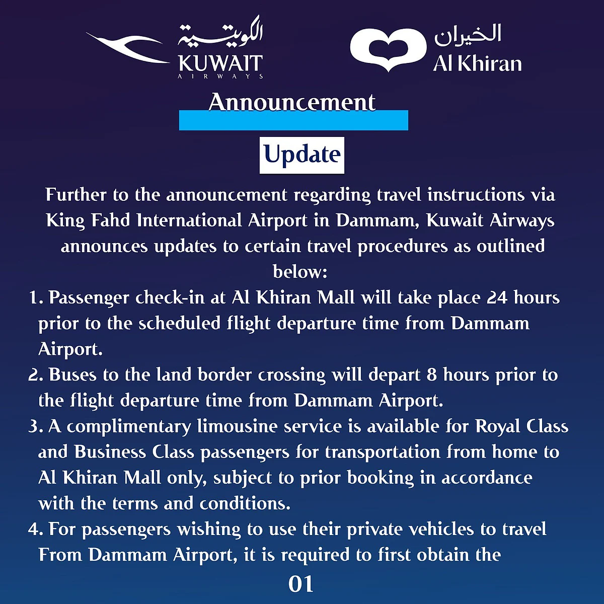 Kuwait Airways has announced updated travel procedures for passengers flying via King Fahd International Airport in Dammam, outlining revised check-in timings and transport arrangements.