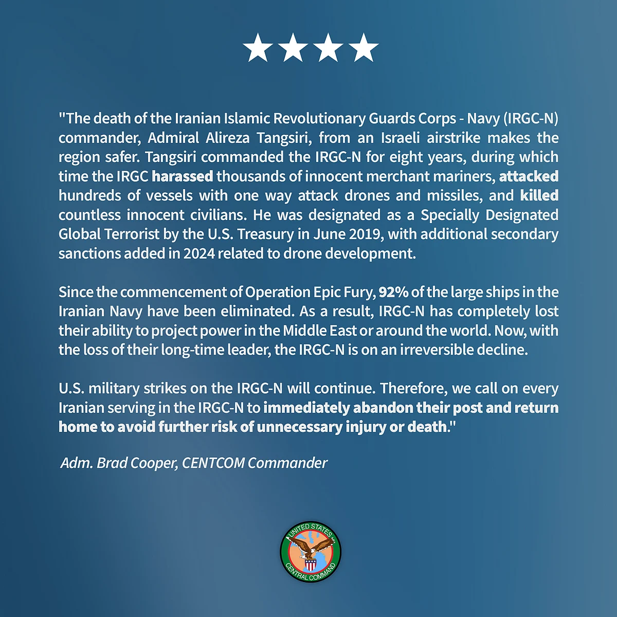 ⚓️ELIMINATED: The IRGC Navy Commander Alireza Tangsiri, in a precise IDF strike in Bandar Abbas. pic.twitter.com/ubrIhNbLL2— Israel Defense Forces (@IDF) March 26, 2026