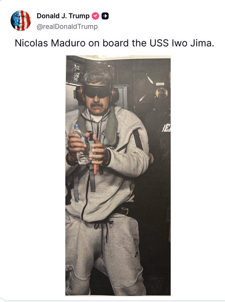 As the world reacted in shock (and, in many parts, jubilation), a photo released by Trump of the captured Venezuelan President aboard the USS Iwo Jima has sparked an unexpected parallel headline: the Nike tracksuit Maduro was dressed in.