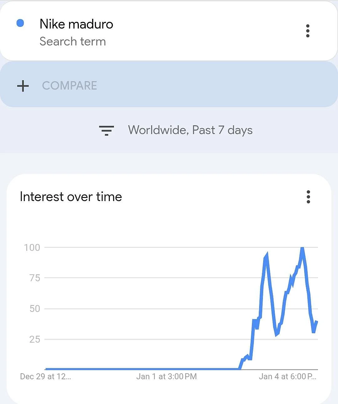 Search trends for 'Nike Maduro' began climbing after the capture and has hit peak levels on Google over the last two days (see image below): Graphic: Google Trends