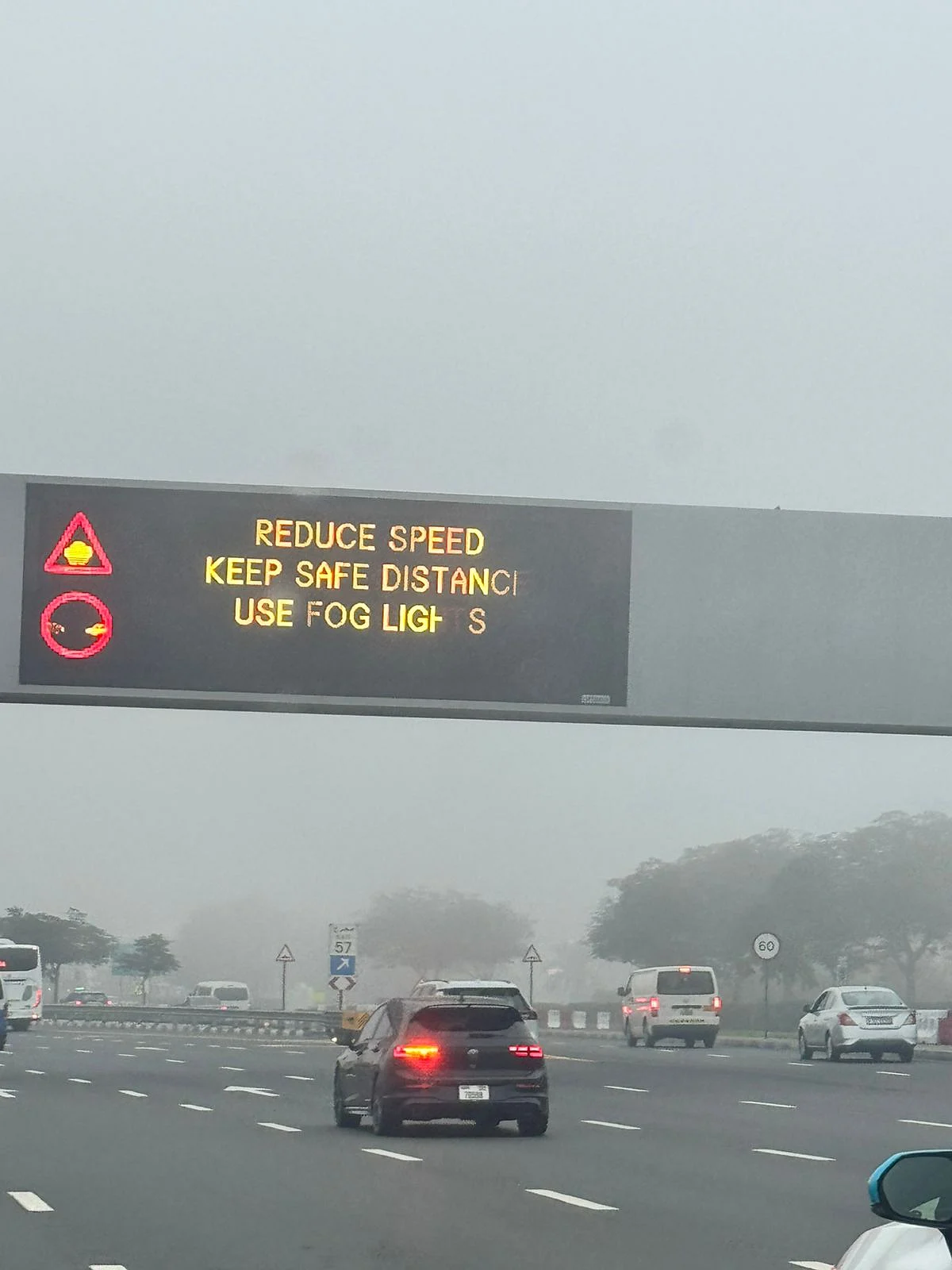 Traffic boards in Dubai display safety warnings due to the thick fog