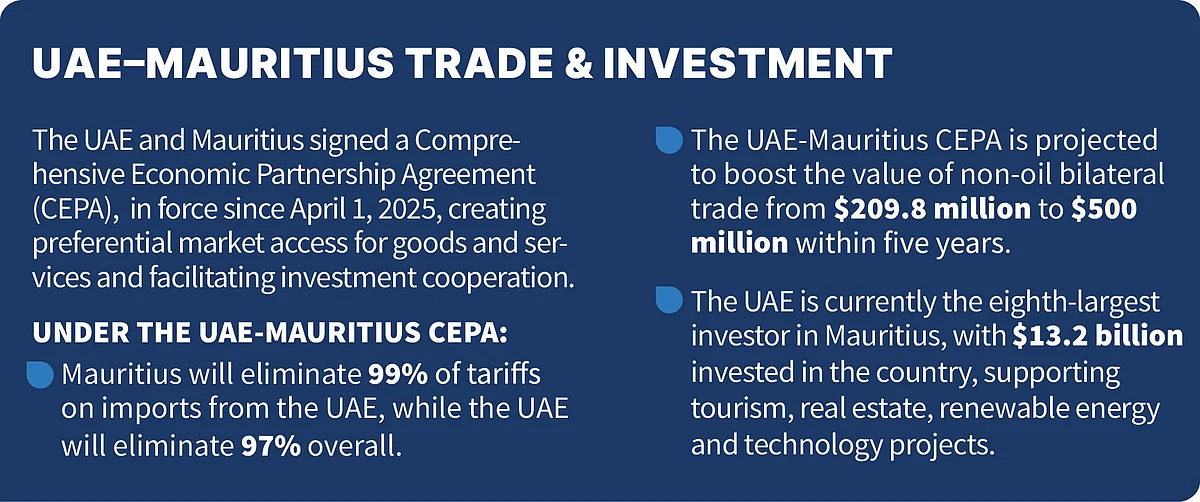 The UAE–Mauritius CEPA is projected to more than double non-oil bilateral trade, from approximately $210 million to $500 million within five years. Under the agreement, Mauritius will eliminate 99 per cent of tariffs on UAE imports, while the UAE will remove 97 per cent overall, significantly improving market access for goods and services.