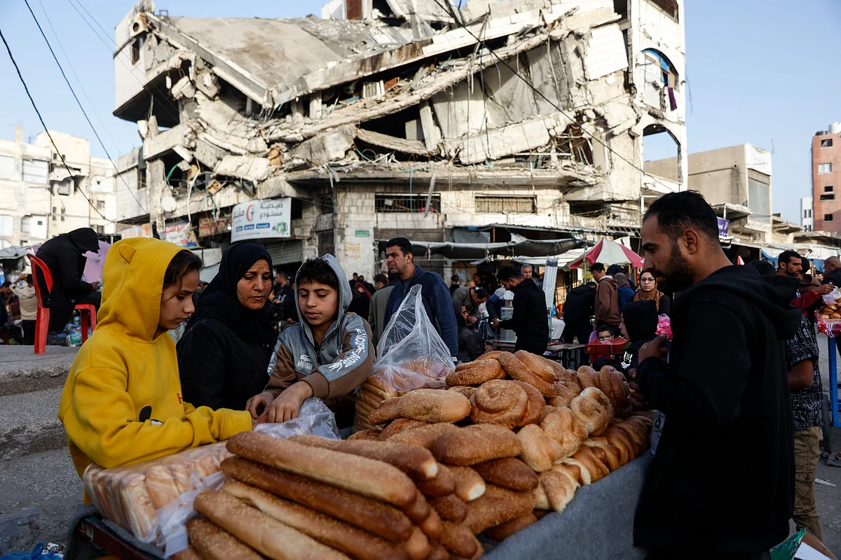 Palestinians sell bread on a street beneath a destroyed building in Gaza City's Zawiya market on February 18, 2026, on the first days of the holy fasting month of Ramadan.