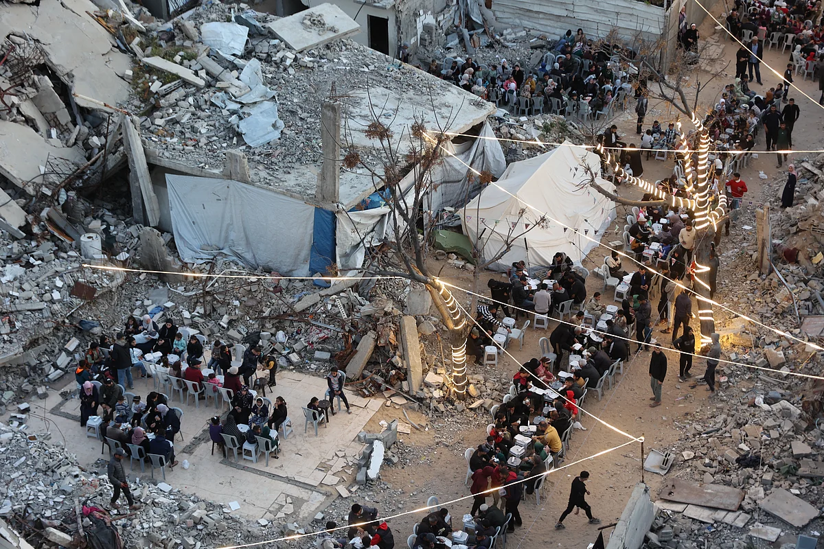 Displaced Palestinians play with fireworks after breaking their fast, inside a damaged building at the Jabalia refugee camp in the northern Gaza Strip, during the Muslim holy fasting month of Ramadan, on February 23, 2026. A displaced Palestinian plays with fireworks after breaking his fast outside a building damaged in Israeli strikes at the Jabalia refugee camp in the northern Gaza Strip during the Muslim holy fasting month of Ramadan on February 23, 2026. Displaced Palestinians gather for their fast-breaking Iftar meal amid the rubble of destroyed buildings at the Jabalia refugee camp in the northern Gaza Strip, during the Muslim holy fasting month of Ramadan, on February 23, 2026. Displaced Palestinians at Jabalia refugee camp in northern Gaza broke their fast for Iftar on February 23, 2026, gathering amid the ruins of destroyed buildings during the holy month of Ramadan. Displaced Palestinian families sit at communal long tables as they gather to break the dawn-to-dusk Ramadan fast during Iftar, in the al-Zahara neighborhood, north of the Nuseirat refugee camp in the central of Gaza Strip on February 21, 2026. On February 18, 2026, Palestinians gathered for a mass Iftar organised by the Turkish IHH Foundation amid the rubble of Gaza City, where Ramadan lanterns and string lights brought a moment of joy to streets of collapsed buildings.Young displaced Palestinians play with Ramadan lanterns as decorations are set up next to their tents at the Bureij refugee camp in the central Gaza Strip on February 15, 2026, ahead of the Muslim holy fasting month of Ramadan. Palestinians sell bread on a street beneath a destroyed building in Gaza City's Zawiya market on February 18, 2026, on the first days of the holy fasting month of Ramadan. 'Everything turned to ash': Gazans return to razed homes'Shivering from cold and fear': Over 42,000 tents damaged as rains ravage Gaza camps