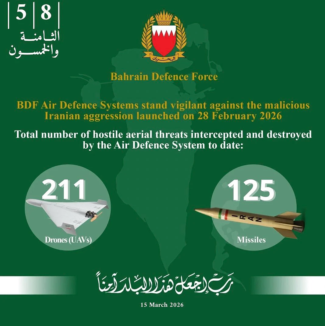 Day 16 of US-Israel-Iran warAs the was enters its 16th day, there has been chatter around keeping the Strait of Hormuz open, with US President Donald Trump urging countries such as China, France, Japan, South Korea and Britain to send warships to help secure the vital pathway, a critical chokepoint for global oil supplies.As of March 15, the war has killed more than 2,000 people, mostly in Iran, according to reports from governments and state media, since Israel and the United States began air attacks on Iran on February 28.Meanwhile in the UAE, air defence systems on March 14 engaged 9 ballistic missiles and 33 UAVs launched from Iran, with no new injuries being reported on Saturday.Stay tuned to Khaleej Times as we bring you the latest developments in the region as they unfold.Trump warship callUS President Donald Trump urged countries such as China, France, Japan, South Korea and Britain to send warships to help secure the Strait of Hormuz, the critical chokepoint for global oil supplies."The Countries of the World that receive Oil through the Hormuz Strait must take care of that passage, and we will help — A LOT!" Trump said on social media.Tankers sail in the Gulf, near the Strait of Hormuz, near the border of Oman’s Musandam governance, amid the US-Israeli conflict with Iran on March 11, 2026Daily updatesSince this war broke out, Khaleej Times has been following up the events and keeping its readers well-informed.Take a look at developments in this escalating conflict:Day 1Day 2Day 3Day 4Day 5Day 6Day 7Day 8Day 9Day 10Day 11Day 12Day 13Day 14Day 15UAE arrests 25 for misleading public opinionThe UAE arrested 25 individuals for their involvement in publishing and circulating digital content intended to mislead public opinion, harm national security and stability, and glorify the Iranian aggression.Investigations into the case revealed that the defendants were divided into three groups that committed various acts.Group 1: Publishing authentic footage of attacks and their impactGroup 2: Publishing fabricated content via artificial intelligenceGroup 3: Promoting a hostile state and glorifying its leadershipThe authority shared images of the arrested with the public, while disclosing their nationalities. GCC condemns attack on US Consulate General in Iraqi KurdistanThe GCC (Gulf Cooperation Council) condemned in the strongest terms the second blatant attack targeting the Consulate General of the UAE in Iraqi Kurdistan.The council's Secretary General stressed that the continuation of these "treacherous assaults" on the UAE consulate constitutes a gross violation of the Vienna Convention on Diplomatic Relations. He further noted that such actions represent a dangerous escalation that threatens the security and safety of diplomats and mission personnel.Overnight attacks in Saudi ArabiaThroughout the night and early morning hours of March 15, Saudi Arabia intercepted drones in parts of the Kingdom. 12.13am: Interception of two drones in the Riyadh and Eastern regions.1.59am: Interception of two drones in the eastern region.2.56am: Interception of a drone in the eastern region.4.37am: Interception of three drones in the eastern region.5.58am: Interception of seven drones in the Riyadh and Eastern regions.6.30am: Interception of two drones in the eastern region.Sirens sounded in BahrainSirens have been sounded in Bahrain, with citizens and residents being urged to remain calm and head to the nearest safe place.Air defence interceptions in Dubai Authorities in Dubai confirmed at 3.18am that the sounds heard in Marina and Al Sufouh areas were due to successful air defence interceptions.Ongoing 'missile threat' in UAEThe UAE's NCEMA said its air defence systems are currently responding to a missile threat. Residents have been urged to remain in a safe location and follow official channels for warnings and updates.Fire at Ruwais oil facility under controlAuthorities in Abu Dhabi have brought a fire under control that broke out after a drone targeted an oil facility in the Ruwais area on Tuesday.The Abu Dhabi Media Office announced that response teams contained the fire and are conducting cooling operations. No injuries were reported in the incident. Non-emergency govt employees ordered to leave OmanThe US State Department said it had ordered non-emergency government employees and the family members of government employees to leave Oman, citing safety risks as the US-Israeli war on Iran continues. F1 races cancelled in Bahrain, Saudi ArabiaFormula 1 officially cancelled races in Bahrain and Saudi Arabia scheduled for April because of safety concerns from the ongoing war in the Middle East.The Bahrain Grand Prix was scheduled for April 12, while the Saudi Arabia Grand Prix was set for April 19."While several alternatives were considered, it was ultimately decided that no substitutions will be made in April," F1 said in a statement.Saudi Arabia intercepts 10 dronesSaudi Arabia said it had intercepted 10 drones in Riyad
