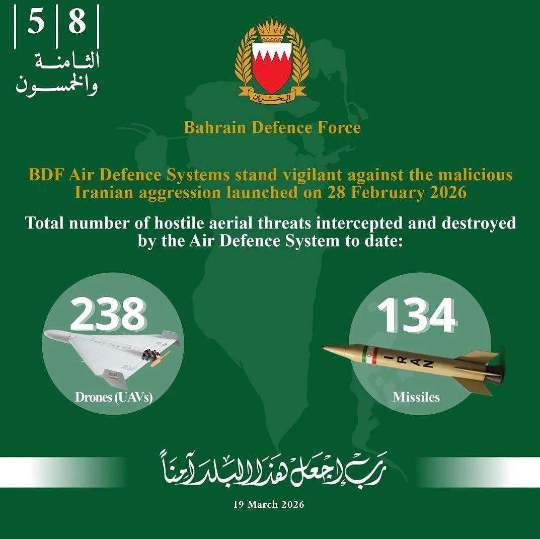 The UAE condemned an Iranian attack on its Habshan gas facility and Bab field, which was intercepted by air defences with no injuries. UAE air defences dealt with 7 ballistic missiles and 15 drones on March 19.