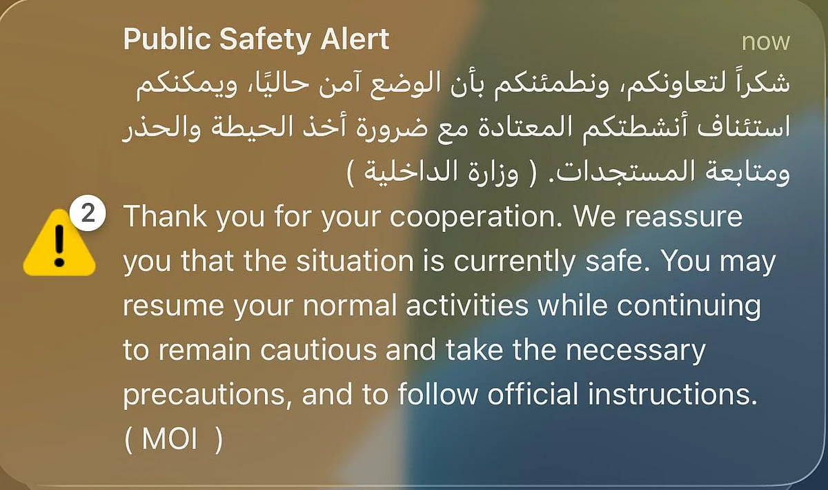 Residents in the UAE received the all-clear alert after a previous missile threat warning, assuring them the situation was safe to resume normal activities.
