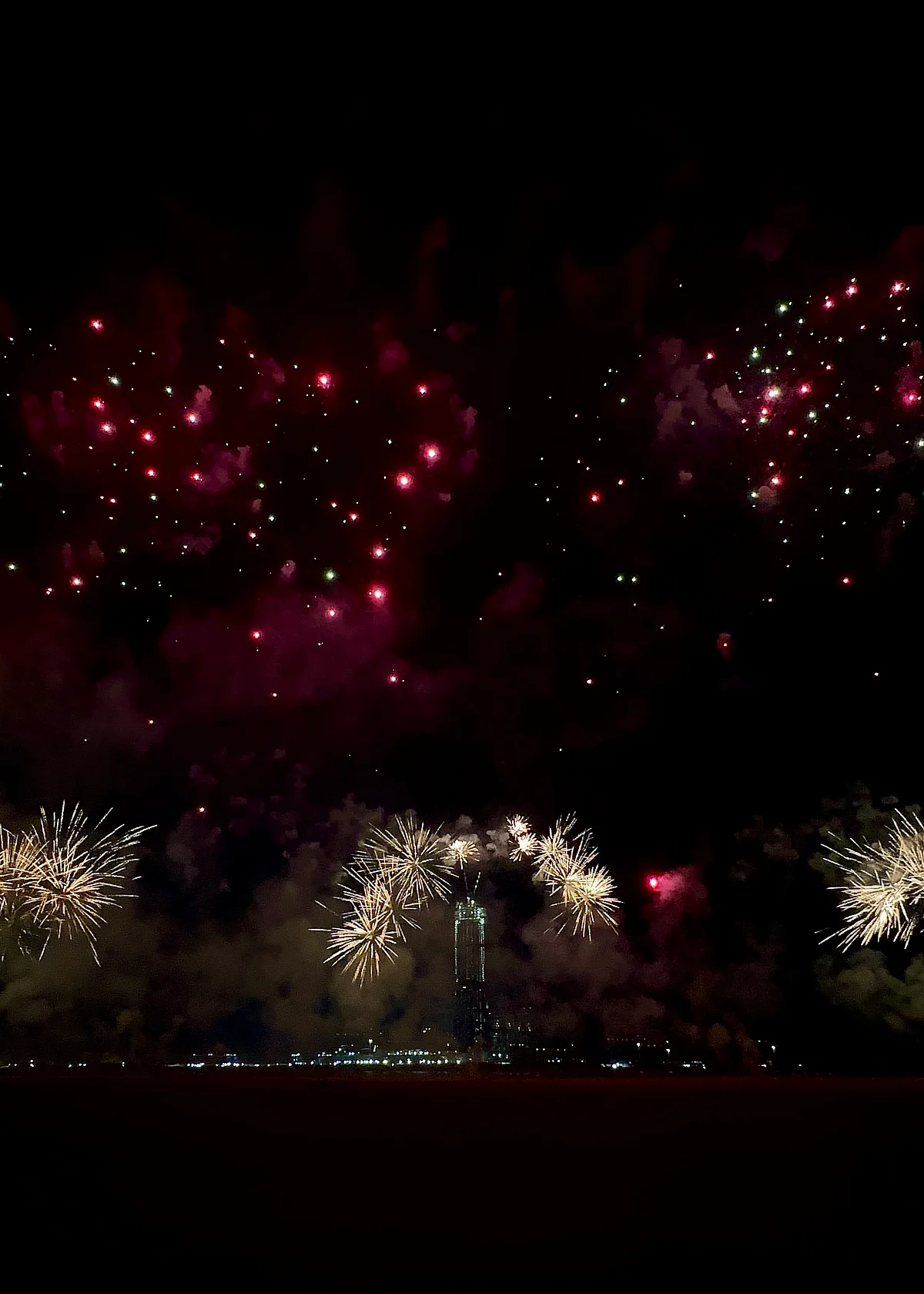 The Sunday night sky in Ras Al Khaimah lit up at 8pm as fireworks burst above Al Marjan Island, casting shimmering reflections across the water and framing the silhouette of the Al Marjan Integrated Wynn Resort.