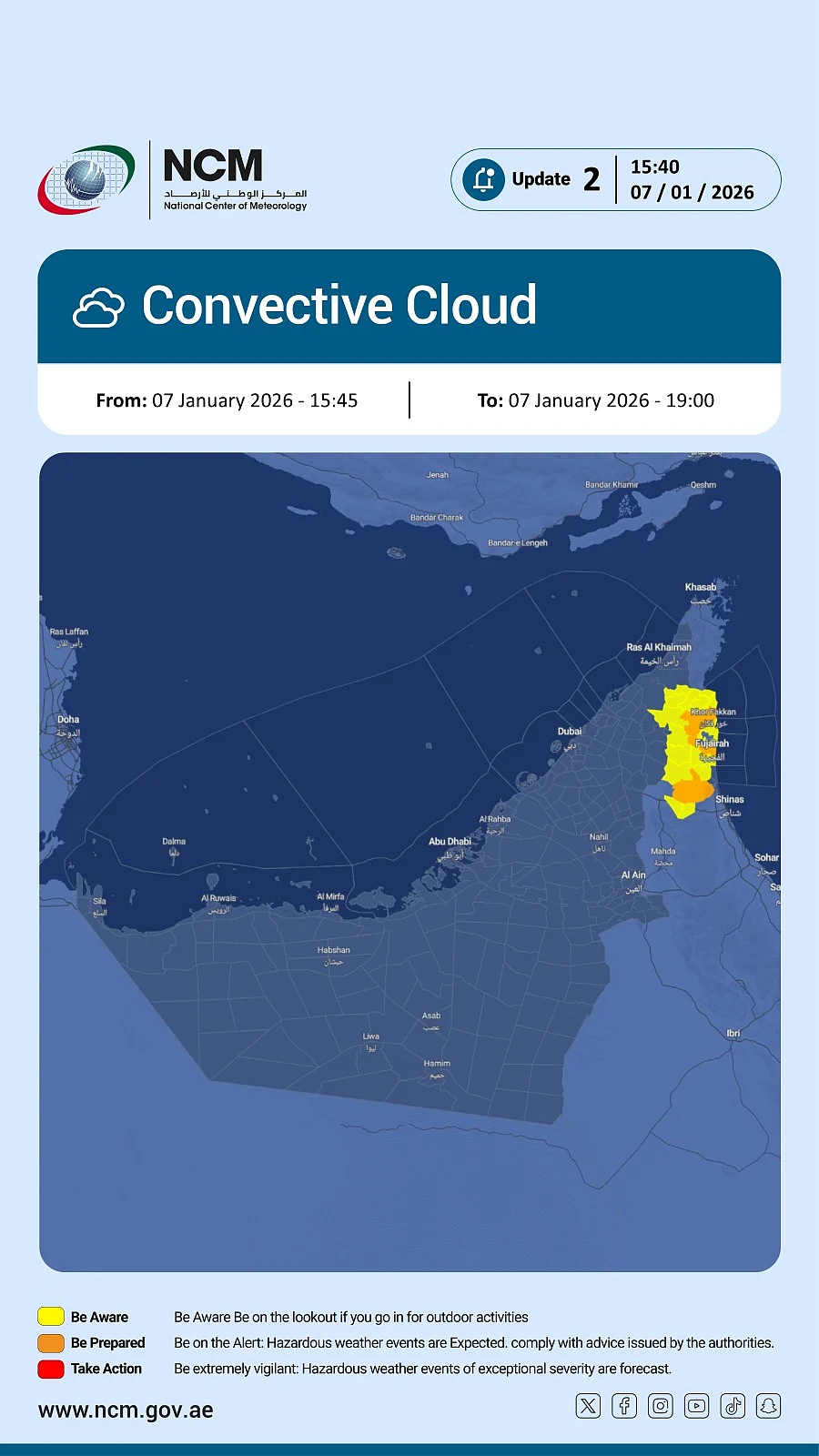 On Wednesday, it issued an orange alert for convective cloud formation in Fujairah until 7pm. Take a look at the affected regions highlighted on the following map: