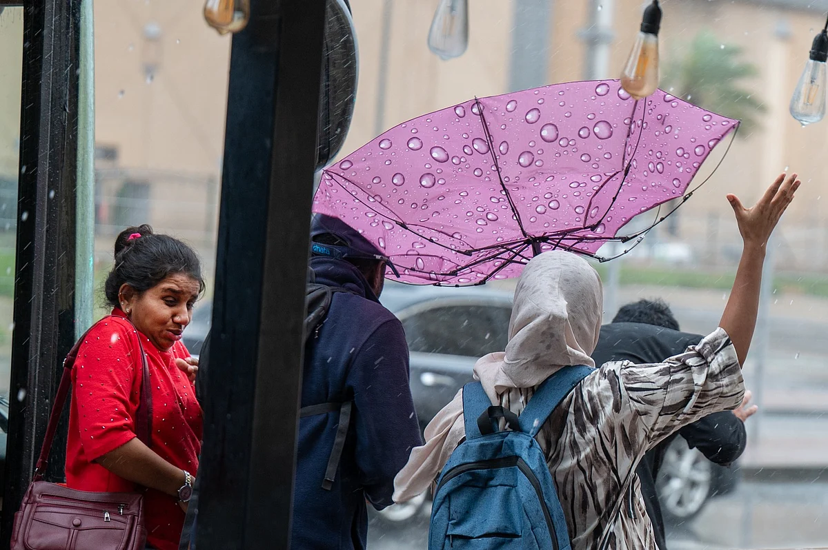 Heavy rain lashes Dubai on Tuesday, as residents take cover under umbrellas.