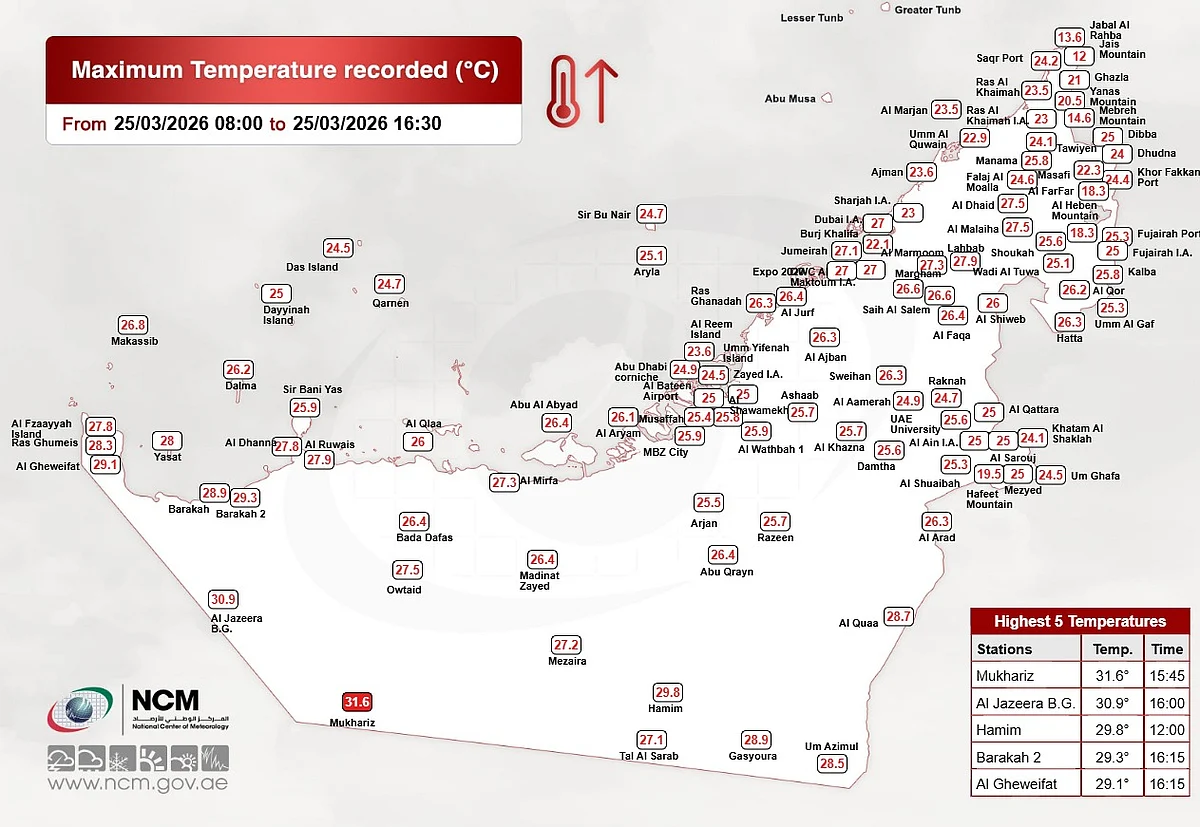 The highest temperature recorded today was 31.6°C in Mukhariz (Al Dhafra Region) at 3.45pm.